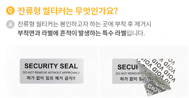 잔류형 봉인지는 투표함에 부착 후 떼어내려고 시도할 경우, 흔적이나 문구가 투표함 표면에 남도록 특수 제작된 봉인지입니다. 마치 'VOID'나 '개봉'과 같은 문자가 남거나, 접착제가 끈적하게 남아 훼손 여부를 명확하게 확인할 수 있도록 설계되어 있습니다.