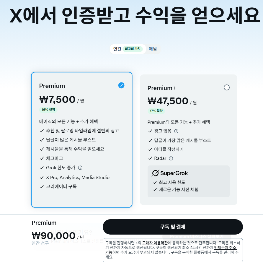 X Premium(구 트위터 블루) 구독: 내가 먼저 유료 구독자여야 합니다. 수익을 창출하려면 투자가 필요해요!