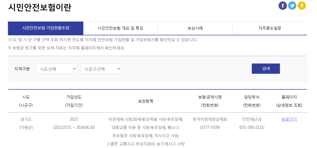 위 사이트에 가시면 지자체 별로 가입한 목록과 시민안전보혐의 개요 및 특징 또 보상사례 와 자주묻는 질문등을 통해 내가 이 보험혜택을 확인하실수 있습니다. 앞으로도 이런일들이 발생할 수 있기에 여러분도 알고 참고 하시면 좋겠습니다.