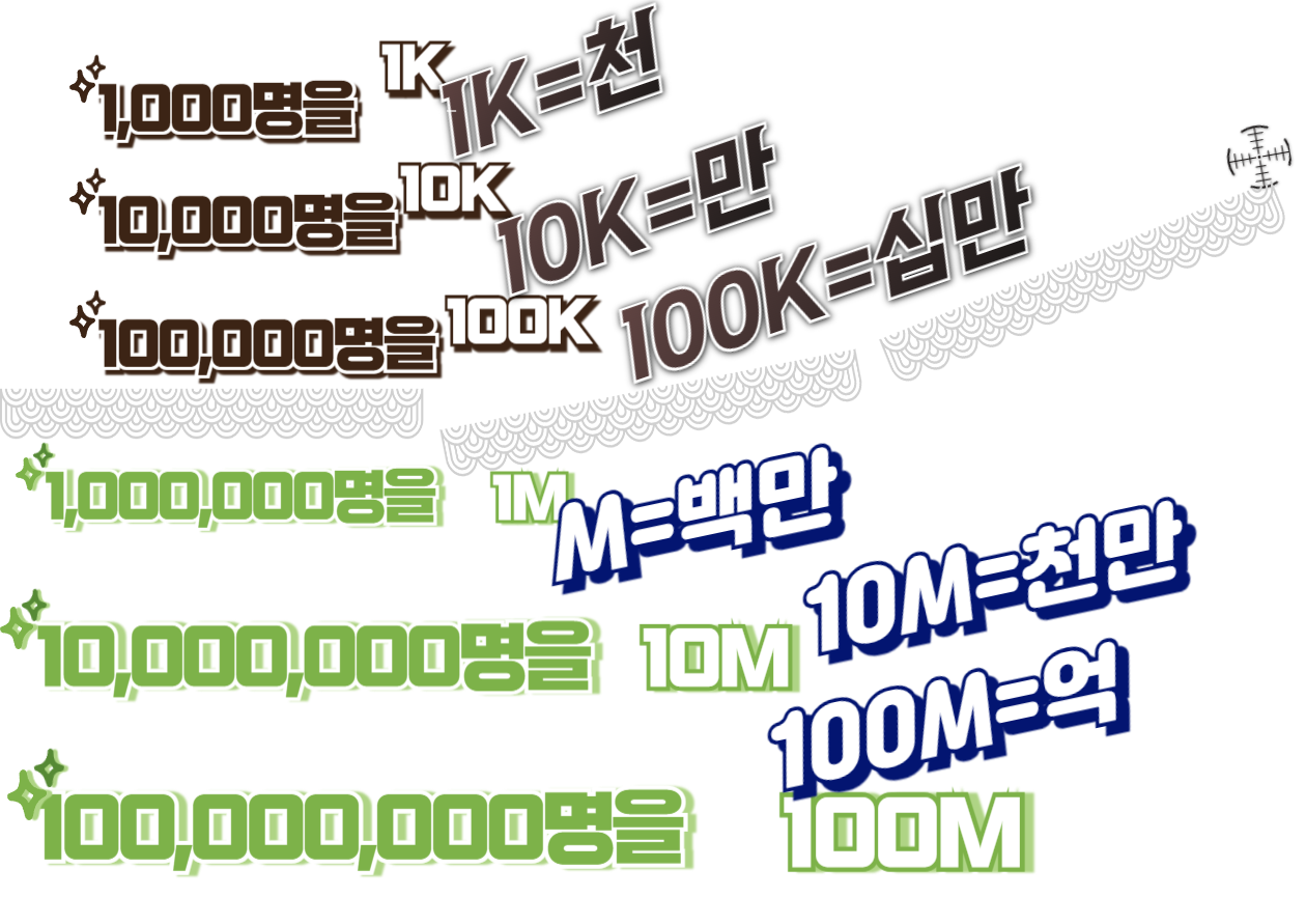 SNS에서는 주로 구독자, 팔로워, 좋아요, 조회수 등을 표현할 때 K, M, B, T 단위를 사용합니다. 예를 들어, 구독자 수가 100만이라면 1M으로 표기합니다.