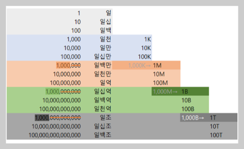 K, M, B, T 단위를 쉽게 알아볼 수 있는 방법은 다음과 같습니다.